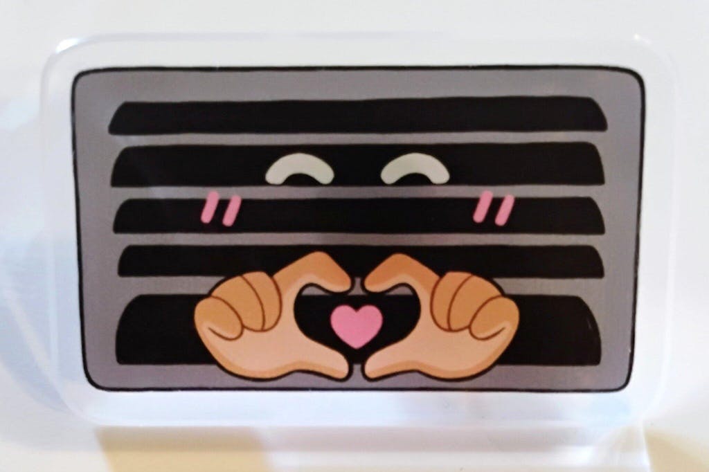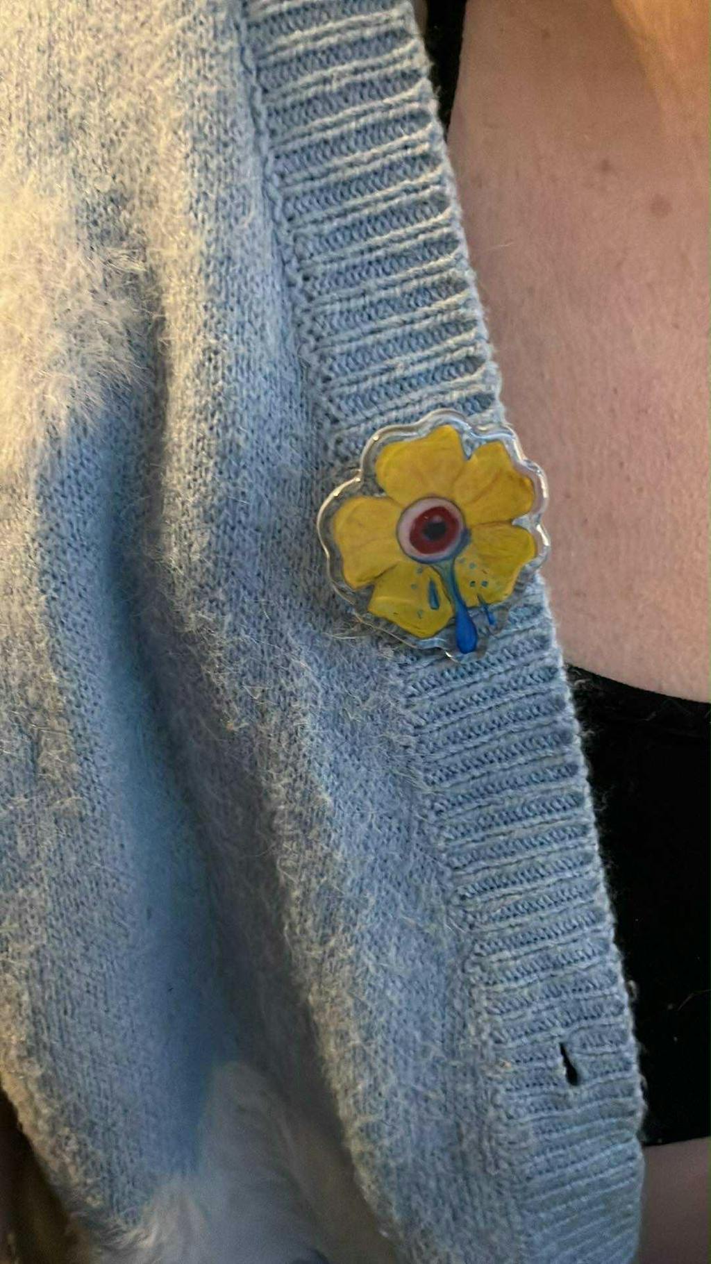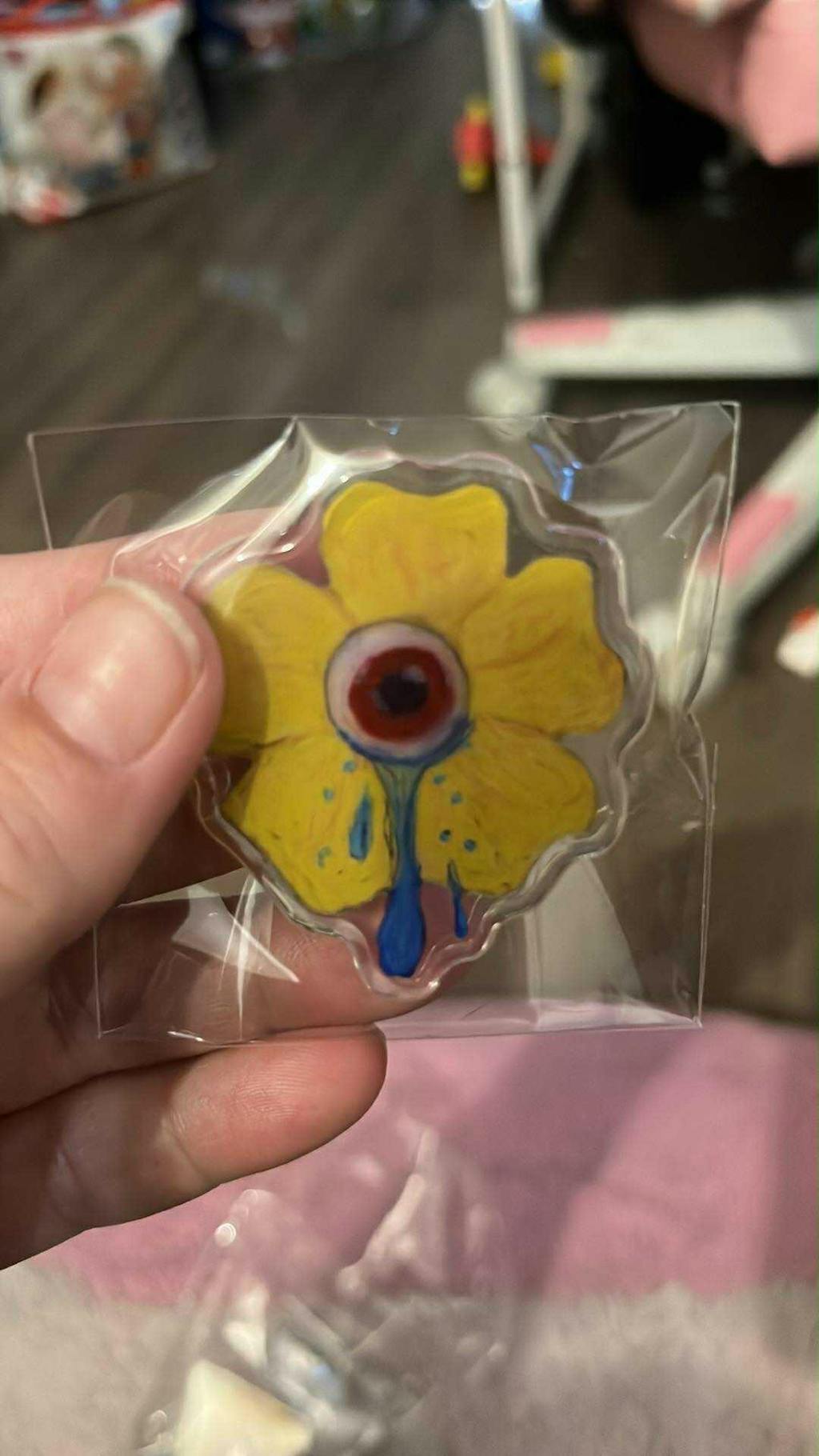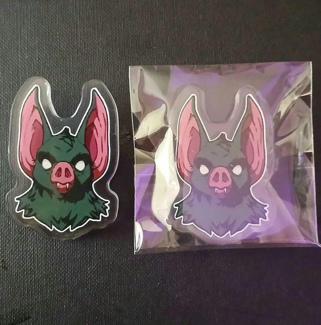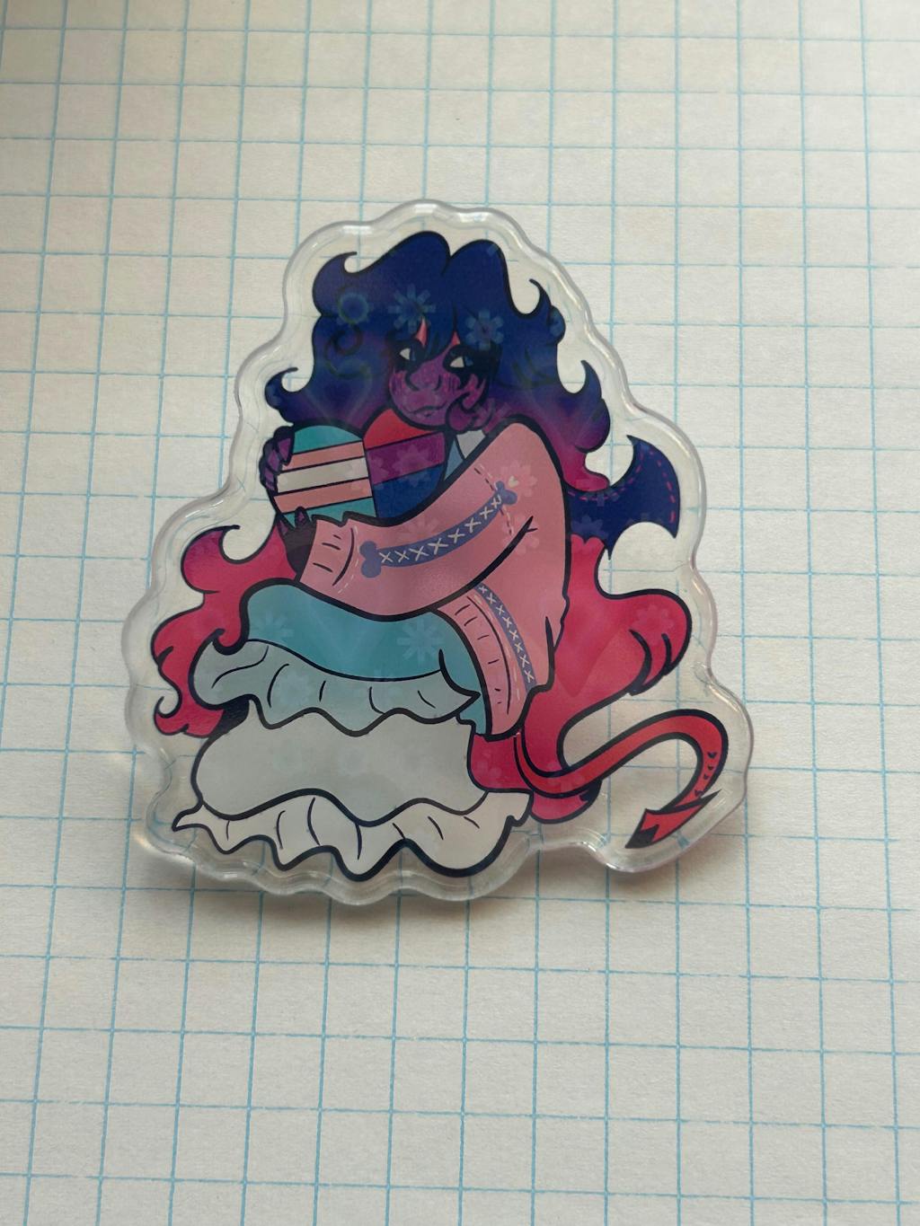 First time ordering an acrylic pin and my lil goober is now a cute lil pin! The holographic affect is really cool and the heart clasp is cute! I have more Pride designs of my characters so I will be ordering again. :3